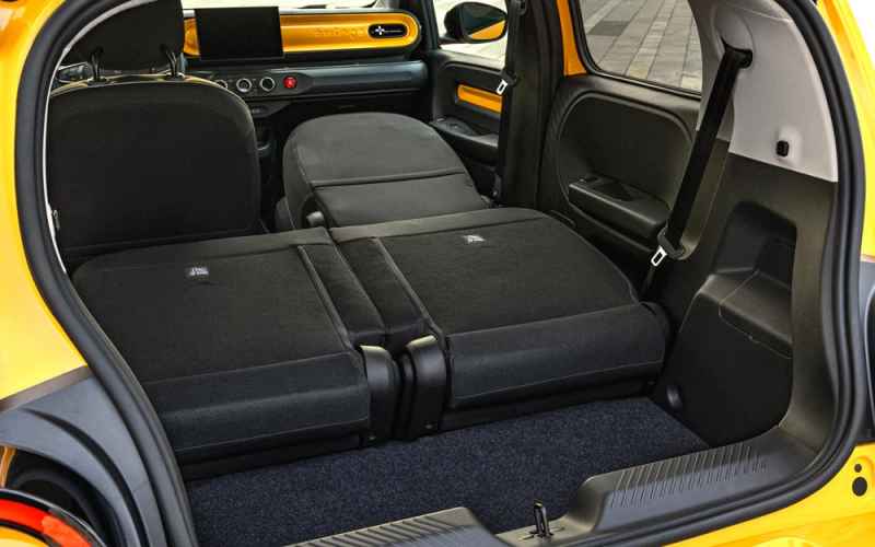La parola d’ordine della Twingo elettrica per gli interni è “modularità”, che si traduce con uno spazio a bordo della vettura sempre più sfruttabile, ove i sedili posteriori scorrono in avanti e indietro di 17 cm in maniera indipendente. Ciò permette di aumentare lo spazio per le gambe dei passeggeri posteriori o di incrementare la capienza del bagagliaio che di partenza è di 206 litri ma arriva a 360 litri con la massima escursione dei sedili posteriori e a 966 litri con i sedili posteriori abbattuti.