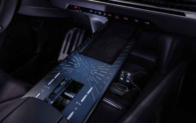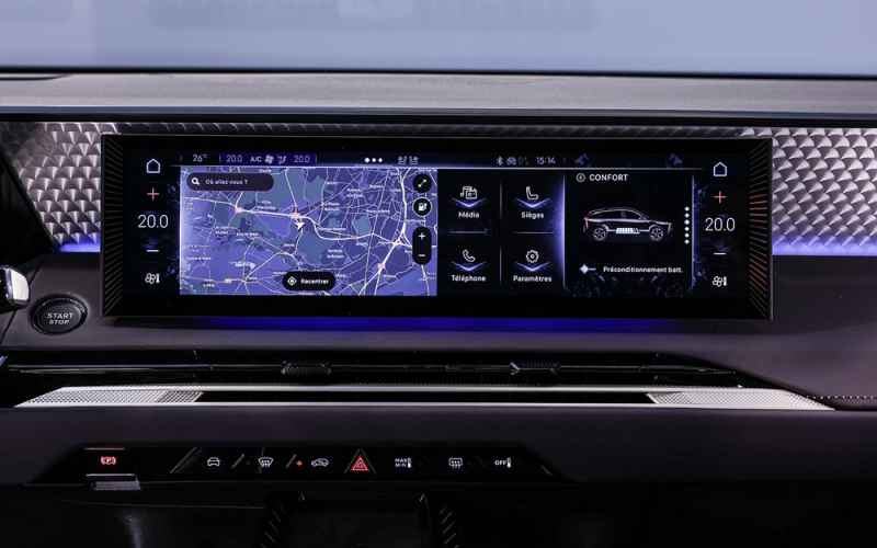 Come già anticipato sulla DS N°7, troviamo al centro della plancia lo schermo da 16” disposto in modalità orizzontale per la gestione dell’infotainment, la regolazione delle funzioni speciali come il massaggio dei sedili, la climatizzazione e le funzioni radio.
