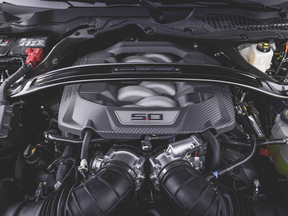 Sotto il cofano troviamo il potente motore Ti-VCT V8 Coyote da 5,0 litri di quarta generazione, con doppio albero a camme in testa e testate in lega di alluminio con quattro valvole per cilindro. Lo zero a cento Km/h viene bruciato in soli 4,4 secondi, uno schiocco di dita e via!